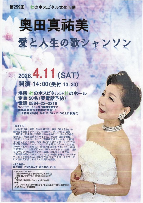 トップページへ戻ります! クスノキ四季彩へ プロフィール 奥田真祐美リサイタルの軌跡 ステージ・ライヴの予定 奥田真祐美シャンソン教室・講座 CD・書籍のご案内 後援会のご案内 個人情報保護法について