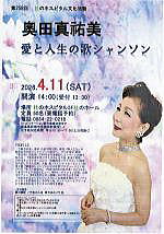 大阪 シャンソンの集い (奧田真祐美シャンソン教室) 会場 :大阪国際交流センター・小ホール 時間 :開場:12時半 開演:13時 ピアノ:津山三知代・石田美智代 司会:高橋魅恵(フリーアナウンサー) |